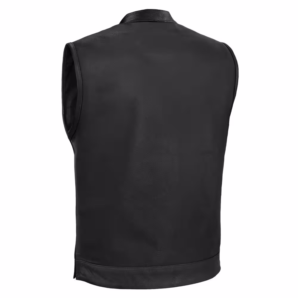 Premium mens motorcycle leather vest with collar, designed for comfort, durability, and classic biker style. Perfect for riding and casual wear.